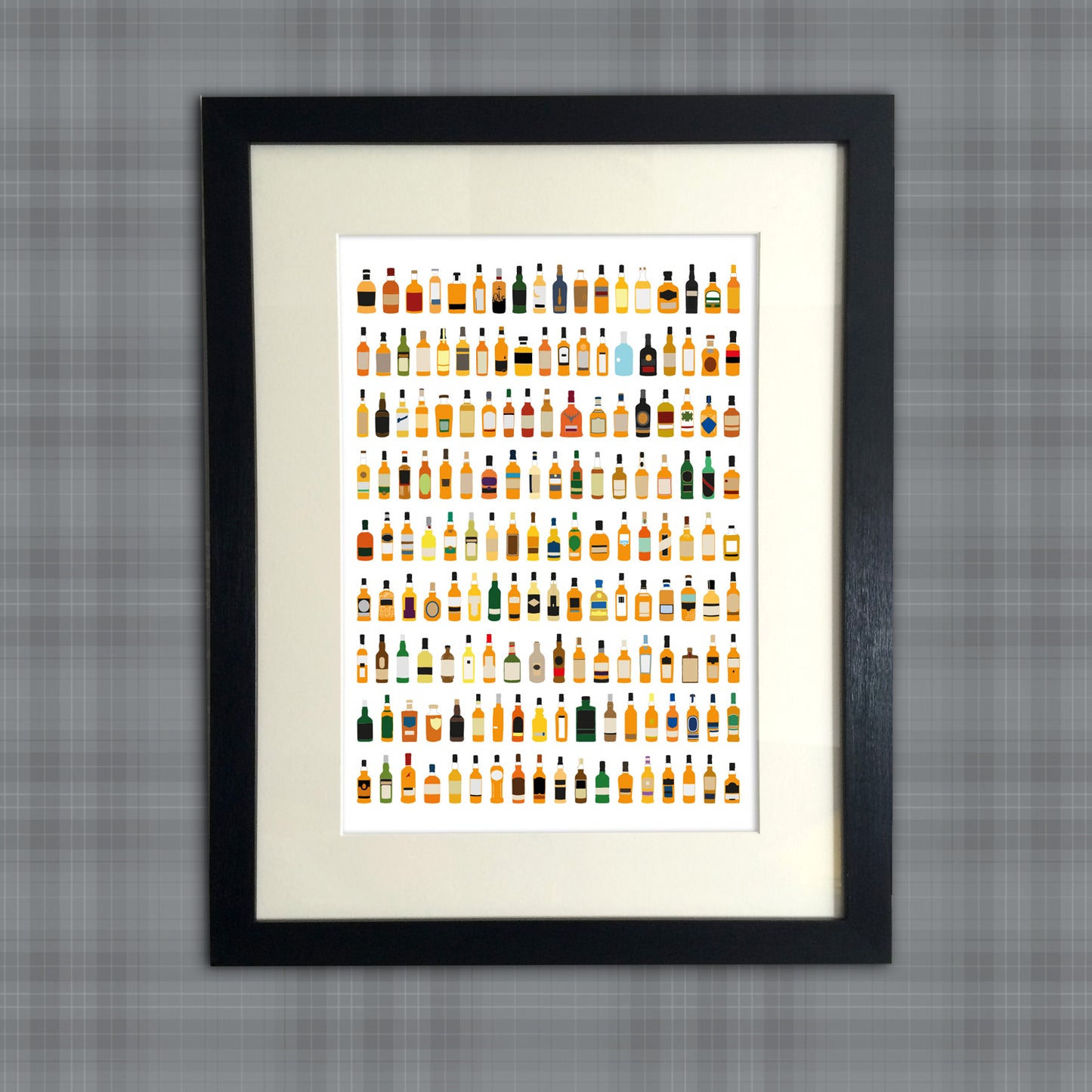 Notre imprimé « Bottled » représente la bouteille emblématique de chaque distillerie d'Écosse, passée et présente !